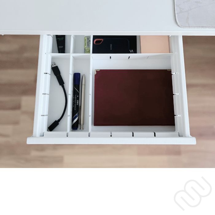Ezért egy olyan fiókmegoldást fejlesztettünk ki, amely az asztal jobb vagy bal szélére rögzíthető, így maximális kényelmet biztosít anélkül, hogy akadályozná a szabad mozgást vagy a helyes üléshelyzetet.