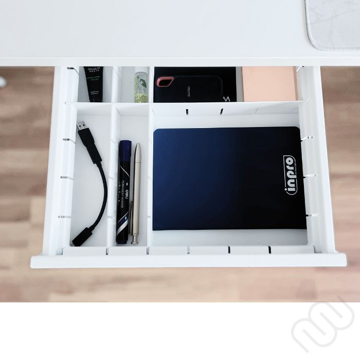 Ezért egy olyan fiókmegoldást fejlesztettünk ki, amely az asztal jobb vagy bal szélére rögzíthető, így maximális kényelmet biztosít anélkül, hogy akadályozná a szabad mozgást vagy a helyes üléshelyzetet.